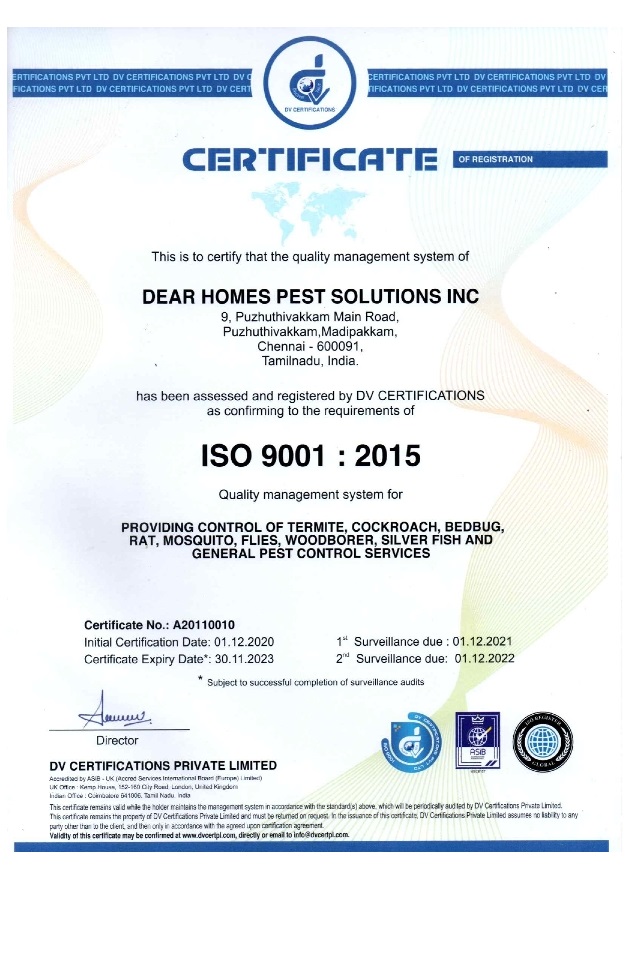 Dear Homes Pest Solutions Inc. is helping more than 1800 clients in controlling the menace of various pests. Being an ISO 9001:2008 certified company, Dear Homes Pest Solutions Inc. provides a professional and comprehensive package in pest management. Both Corporates and Residential buildings benefit by professional pest management solutions for Rodents, General Pests, Bed bug, Termites, Cockroach, Rats, Mosquito, Flies etc. Our
